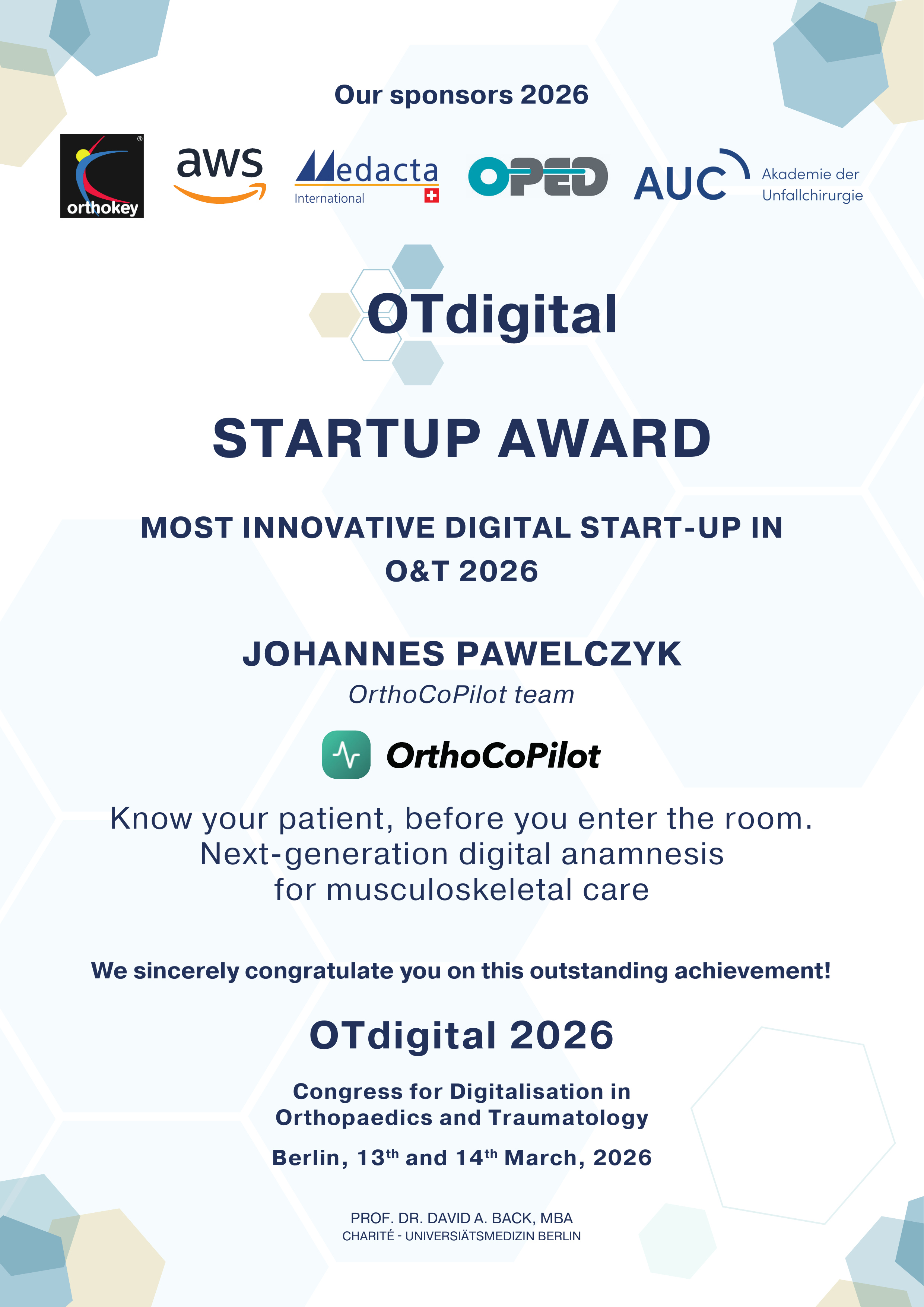 We are truly delighted for the winners continuing with our tradition of annually honoring the most innovative digital startup in orthopaedics and traumatology at our OTdigital congress.
